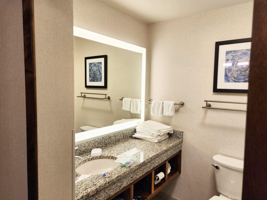 Hiccups–The hotel provided toiletries are not great, so definitely bring your own. The shampoo in the shower was mostly water (the showerhead dripped right into the container). Speaking of showerheads, the water pressure was on the low side–my youngest loved it, but I prefer a more robust stream.